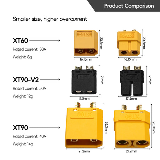 QS ConnectorConnector: XT90 50A connector Wire range: 12AWG-16AWG wire small size high current